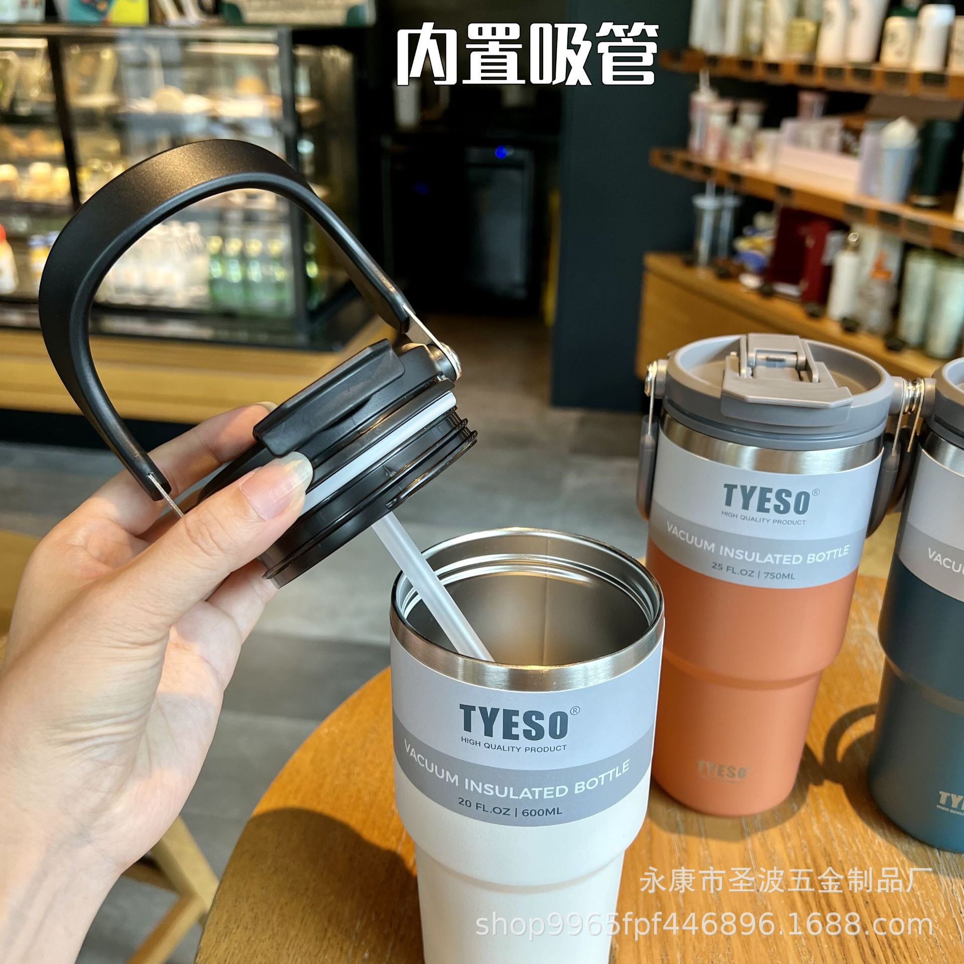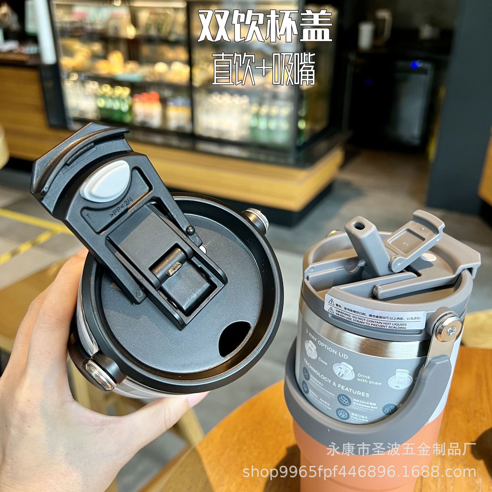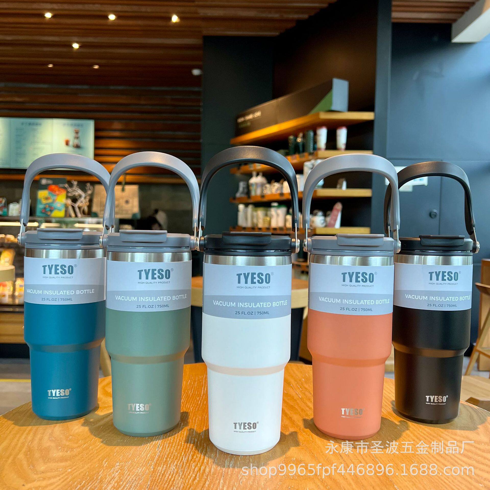 車載隨手翻蓋咖啡杯戶外提手杯大容量304不銹鋼帶吸管保溫杯