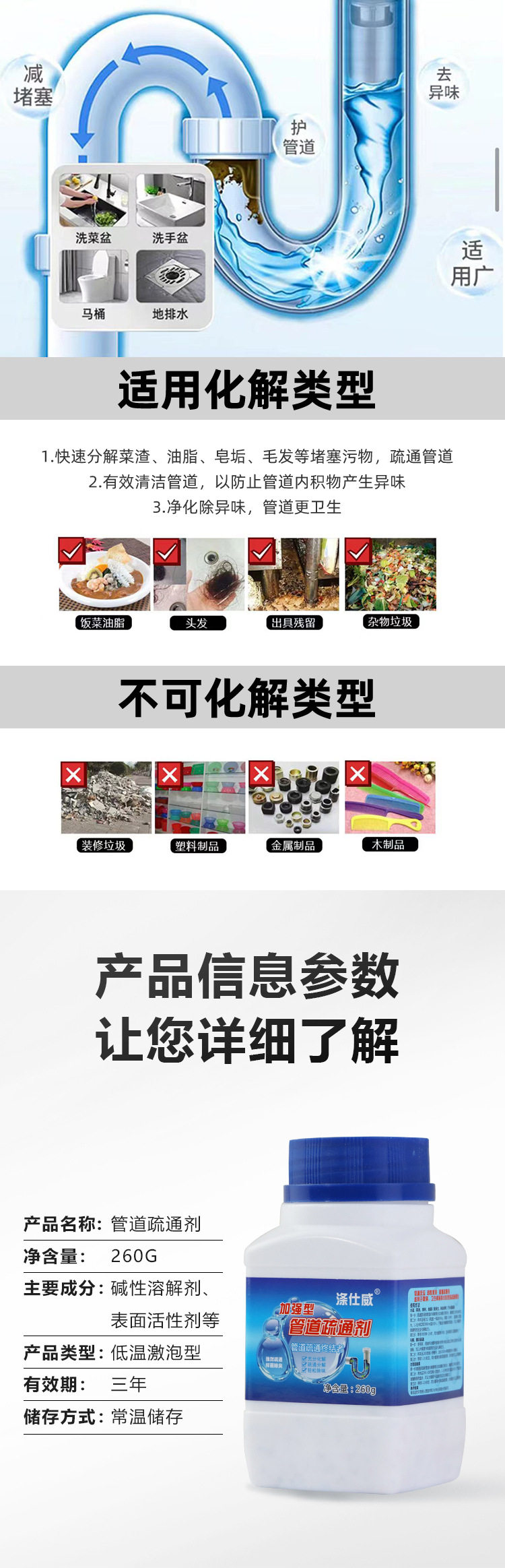 管道疏通清潔劑260g 滌仕威正品管道疏通清潔劑260g 滌仕威管道疏通劑強溶解力下水道疏通劑批發廚房廁所除臭劑管道通